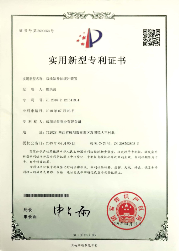 咸陽(yáng)華星泵業(yè)有限公司專利證書