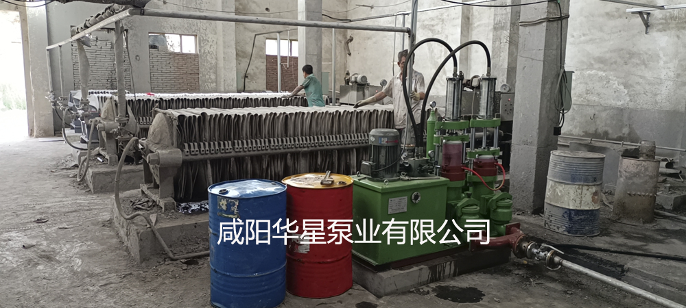 一臺(tái)華星柱塞泥漿泵給4臺(tái)壓濾機(jī)進(jìn)料